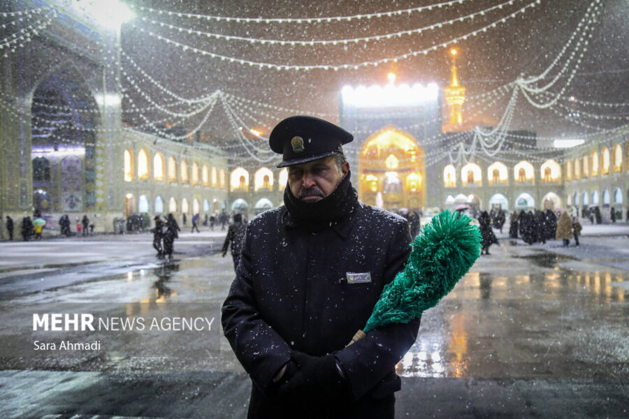 به گزارش خبرنگار مهر، بارش برف حرم مطهر امام رضا (ع) را سفیدپوش کرد و حال‌وهوایی متفاوت به مشهد مقدس بخشید. همزمان با تداوم بارش‌ها، خدام آستان قدس رضوی با انجام عملیات برف‌روبی در صحن‌ها و مسیرهای تردد زائران، زمینه تداوم زیارت ایمن و روان را فراهم کردند.