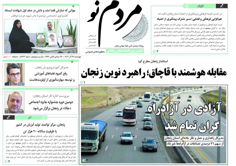 صفحه اول روزنامه های زنجان ۲۶ آذر ۱۴۰۴