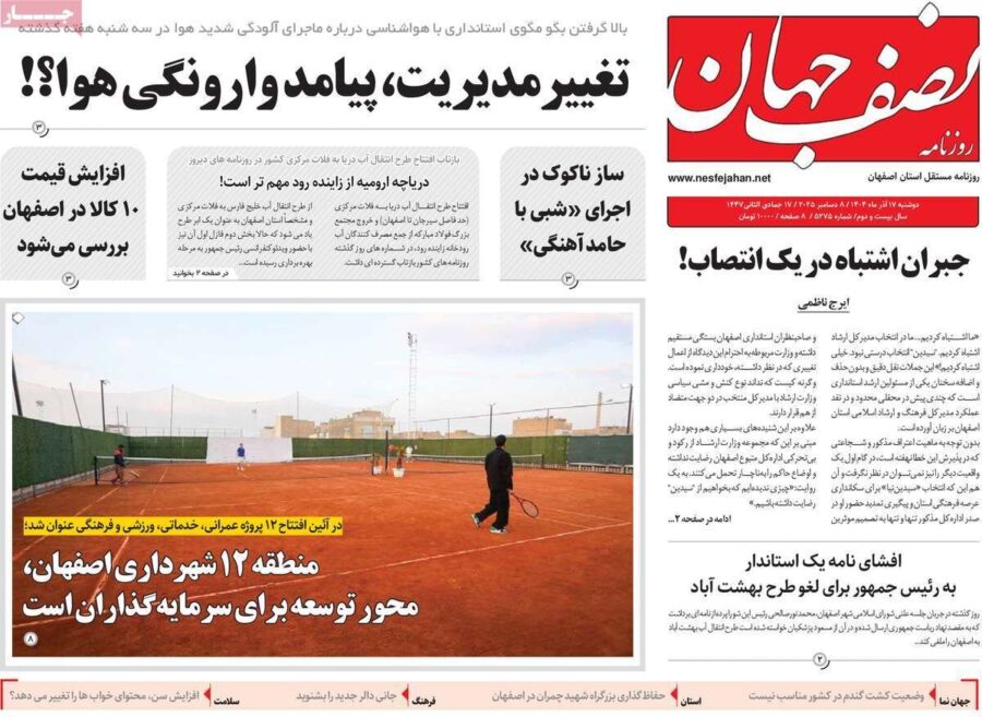 صفحه نخست روزنامه‌های اصفهان دوشنبه ۱۷ آذر