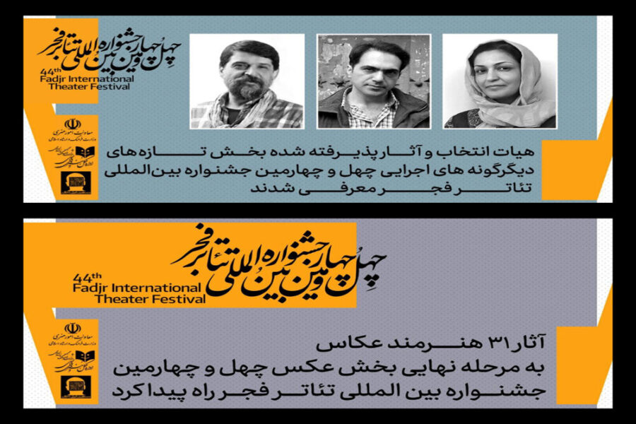همچنین سیدوحید فخرموسوی دبیر چهل و چهارمین جشنواره بینالمللی تئاتر فجر، طی حکمی شیوا مسعودی، امیر راد و فرشاد یاری را به عنوان هیئت انتخاب آثار بخش تازههای دیگرگونههای اجرایی این دوره از جشنواره معرفی کرد. هیئت داوران این بخش پس از بررسی تعداد ۸۲ اثر نمایشی ارسال شده به دبیر خانه جشنواره، تعداد ۱۰ اثر را به مرحله نهایی این بخش معرفی کردند و از این تعداد ۶ اثر از تهران و تعداد ۴ اثر از دیگر شهرهای کشور حضور دارند.