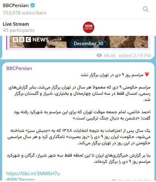 به گزارش خبرنگار سیاسی خبرگزاری تسنیم، بی‌بی‌سیِ فارسی عصر امروز در خبری نوشت که مراسم «مراسم روز 9 دی در تهران برگزار نشد»!